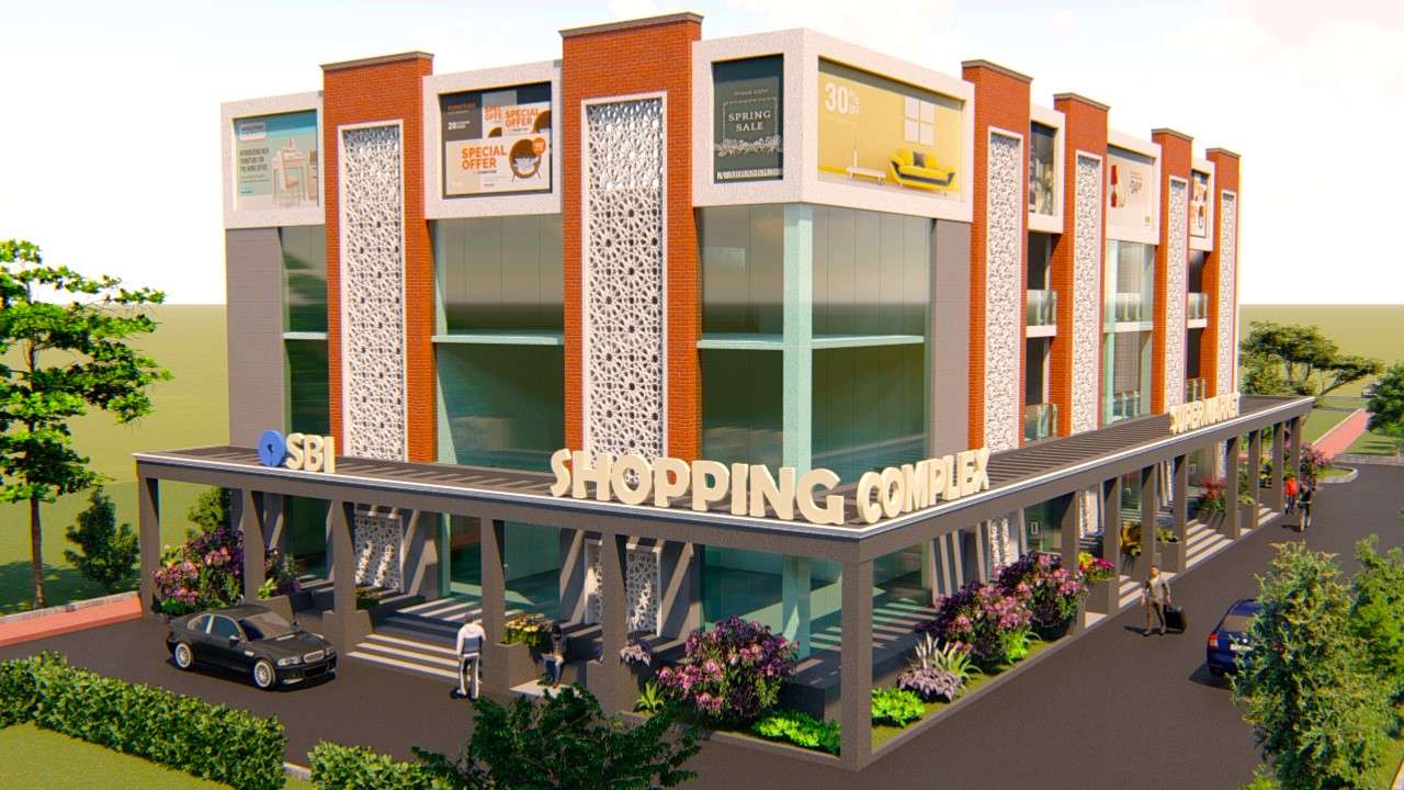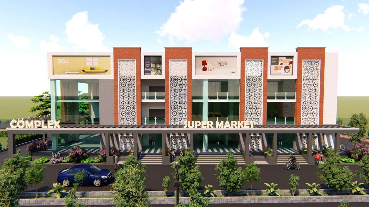 This commercial development is a contemporary mixed-use complex that integrates retail, banking, and supermarket services under one roof. The design showcases a clean, modern aesthetic with functional zoning and vibrant visual appeal.