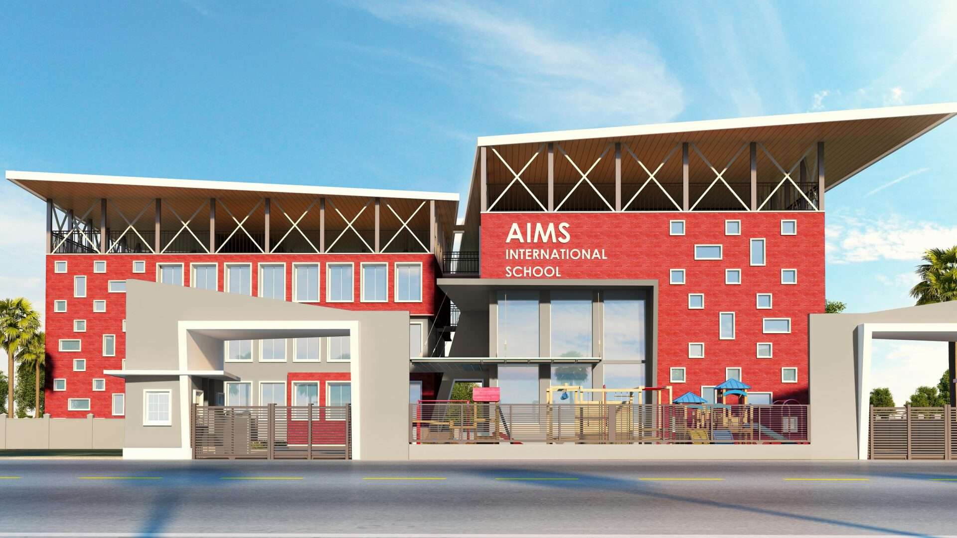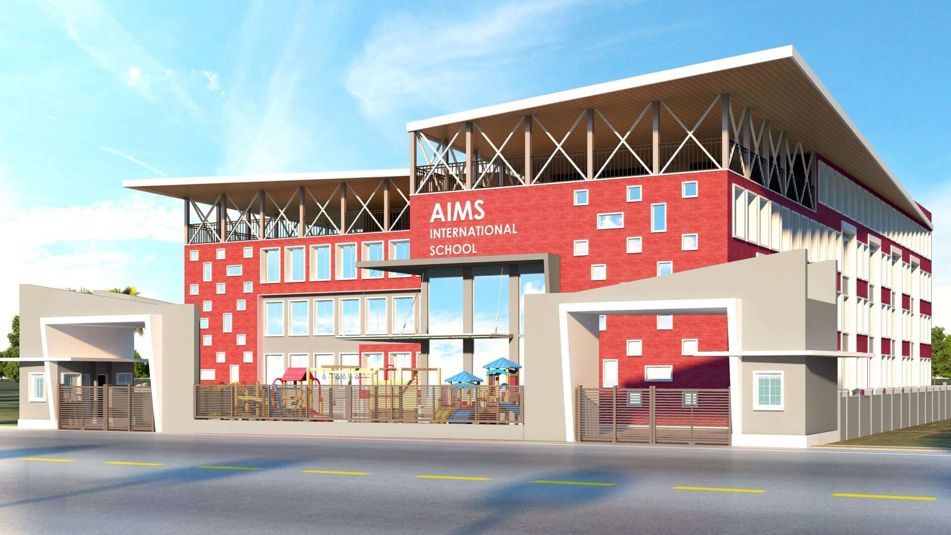 The elevation of AIMS International School is characterized by a bold, modern expression combined with functional geometry. The primary façade utilizes a rich terracotta red brick texture juxtaposed with grey and white accents, creating a striking contemporary aesthetic.
