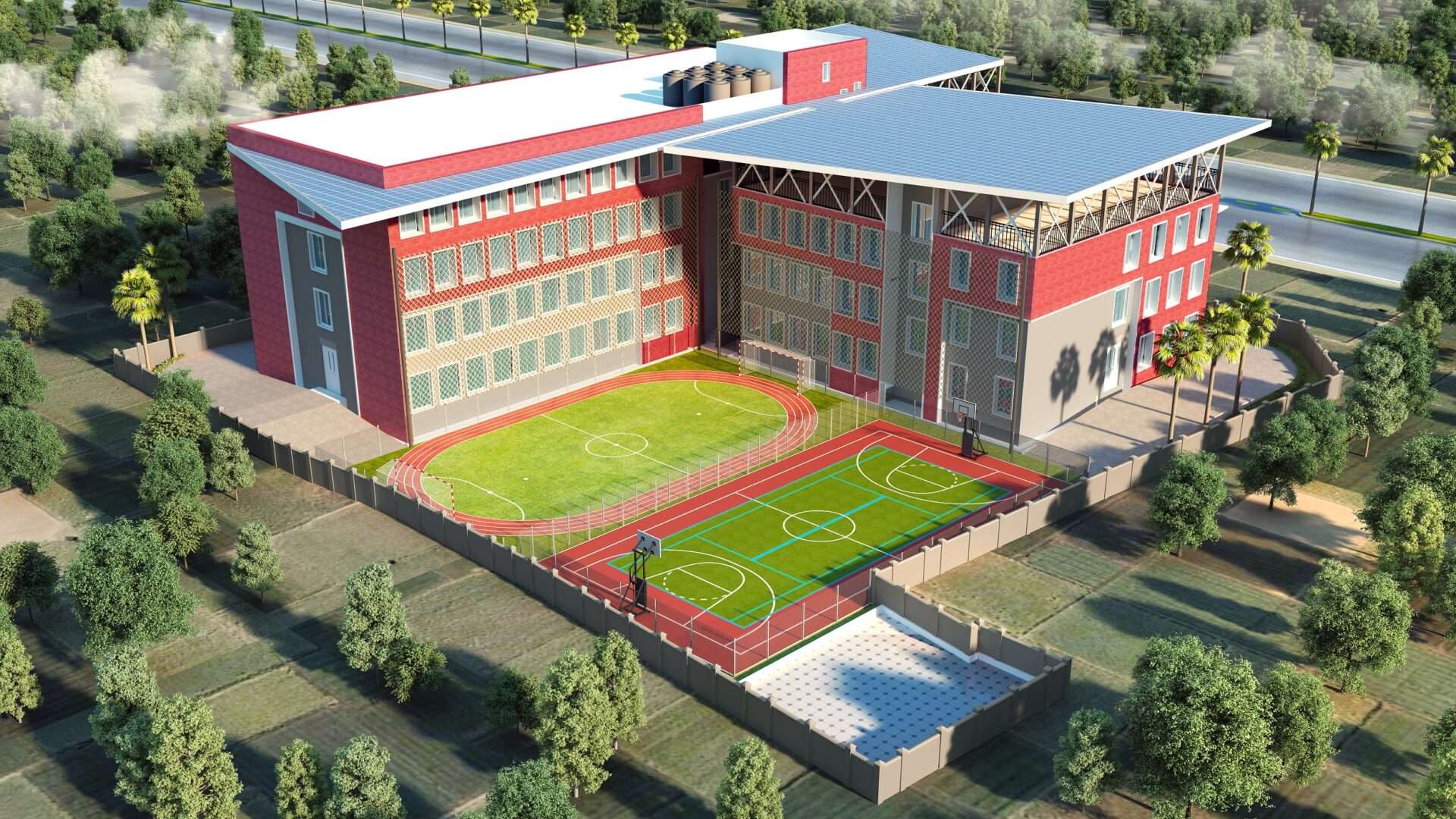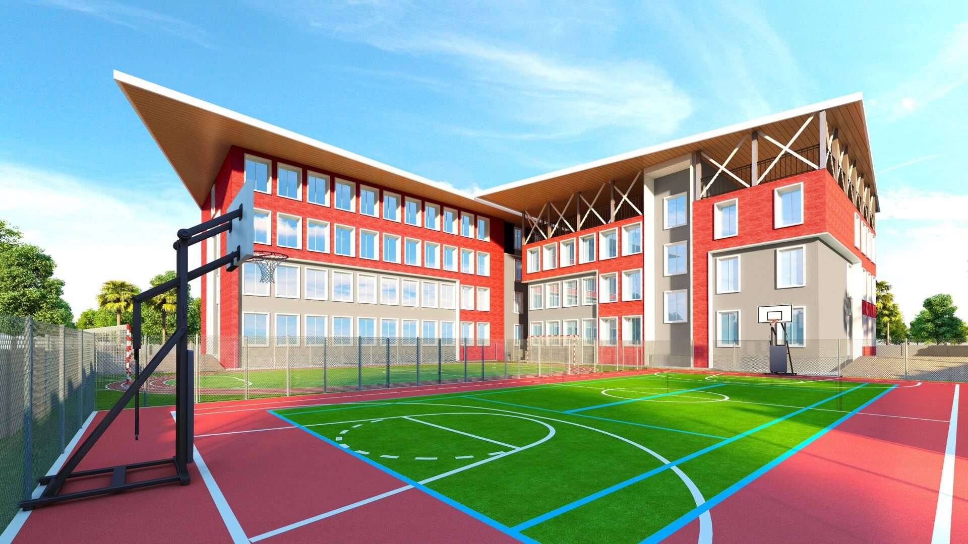 At ground level, the main entry is welcoming and secure, flanked by a robust grey-and-white gate structure that emphasizes institutional identity and control. The front elevation also integrates a secure play area, likely for early learners, adding life and child-centric energy to the school frontage.